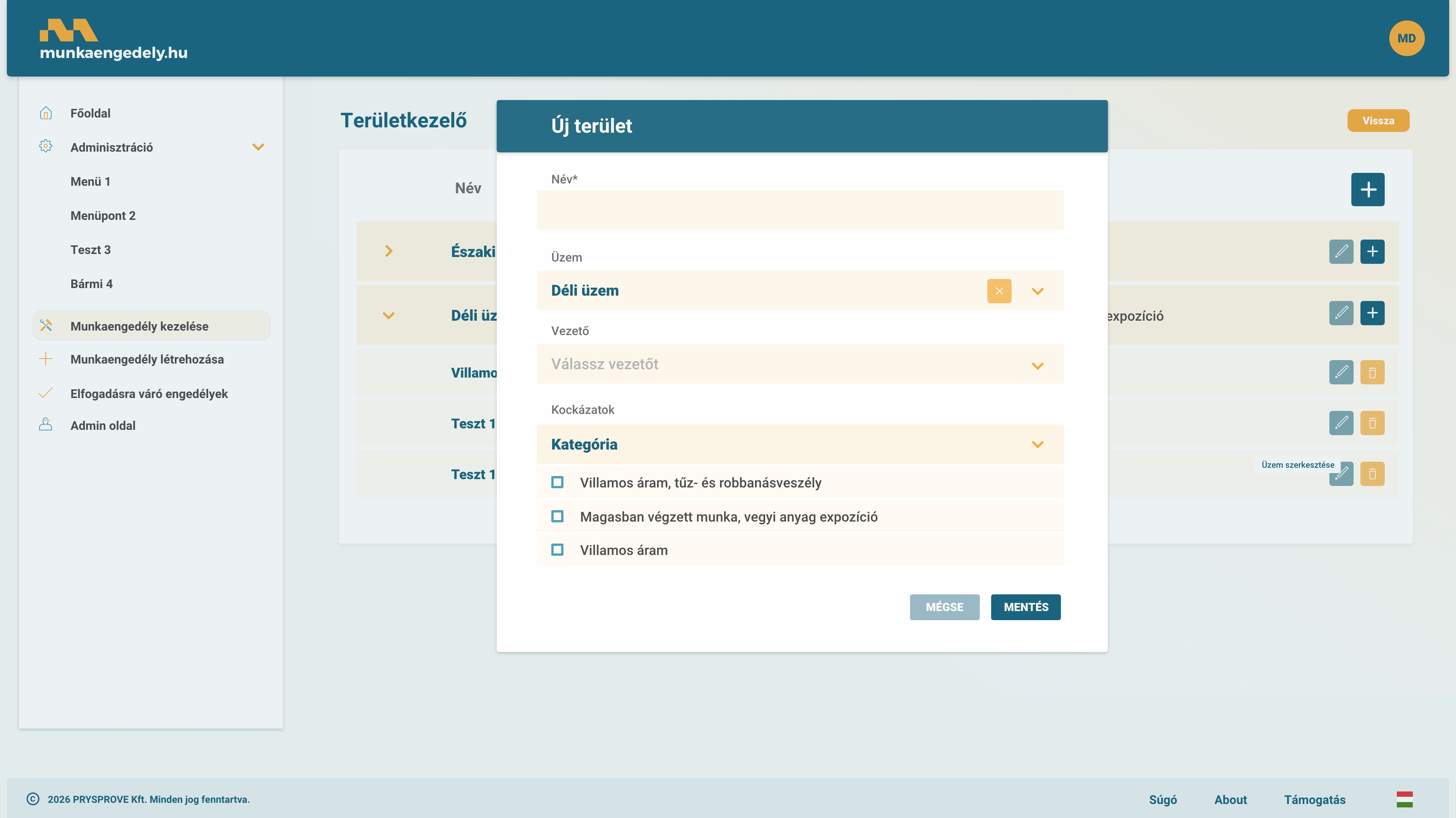 Az üzemhez és területeihez egyedi kockázatokat is hozzárendelhet, melyet automatikusan kezel a szoftver. Ennek köszönhetően folyamatosan naprakész állapotban tarthatja az üzemi kockázatokat, és a munkaengedélyek kiadásakor a rendszer figyelembe veszi az adott terület specifikus veszélyforrásait.